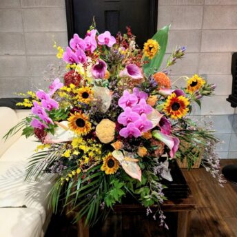 開店や、お祝いのお花でひときわ目を引くのがスタンド花です。色とりどりの華やかさで、おめでとうを印象付けます。送り主のお名前、メッセージなどを、書いたお札をお付けします。