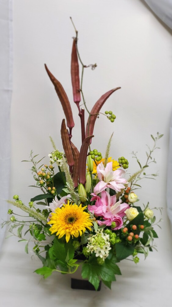 今回は季節の花材、オクラ、石化柳、八重咲きユリ